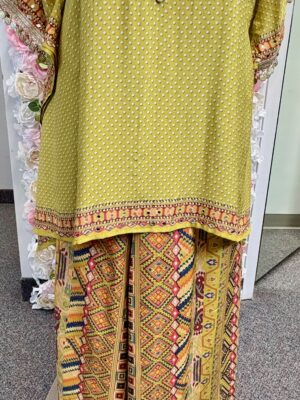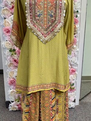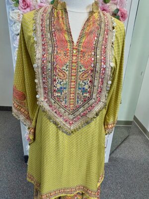 Printed Olive Green Kaftan with Mirror Work & Palazzo Set
