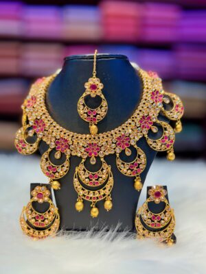 Fancy Party Gold Kundan Necklace Choker White Crimson Maroon stones Earrings Maang Tikka Set