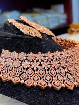 Faux Diamond Rose Gold Necklace Choker Earrings Set